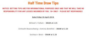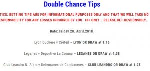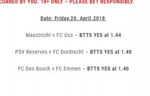 Friday Bet Won April 21, 2018 JP Double Chance, Half Time Draw and Both Teams To Score betting tips all won on Friday 20th April 2018. Tagged with btts, dc, football, half time draw, mauri.bet, mauribet, soccer Misc